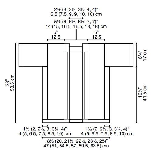 Note: Pattern is designed to be worn open in front and can be stretched to pin closed at top of bust. Fronts do not meet at center front. Pattern is worked in 3 panels that are joined together and then sleeves are worked directly onto sleeve openings.